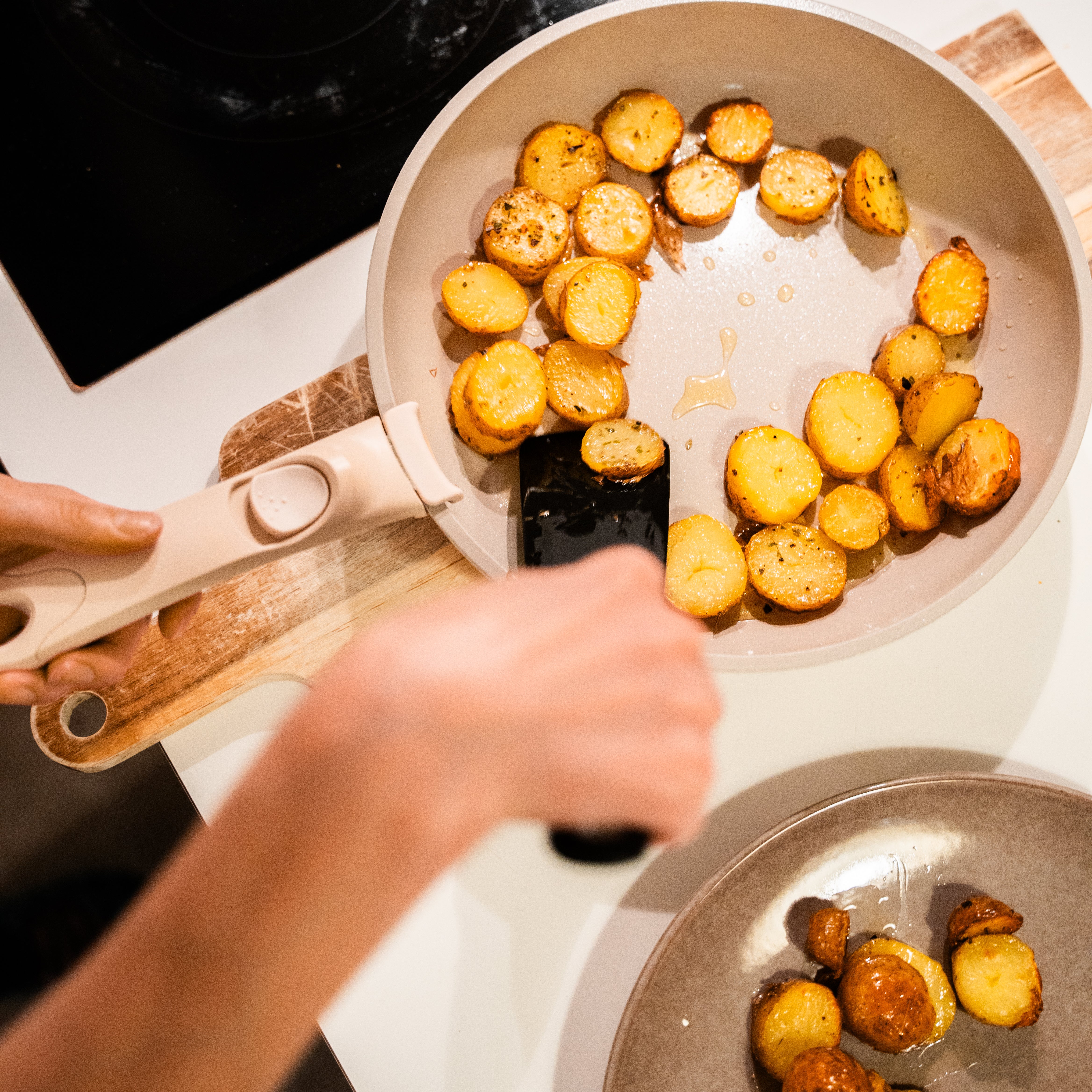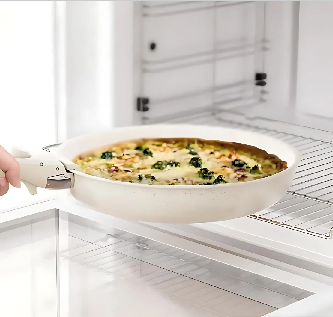 Vores kemikaliefri granitbelægning sikrer sund madlavning, mens aftagelige håndtag giver fleksibilitet mellem komfur, ovn, bord og køleskab.